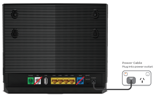 - Use the supplied power cable to connect the modem’s POWER port to an available power outlet, then turn the modem on using the ON/OFF button.